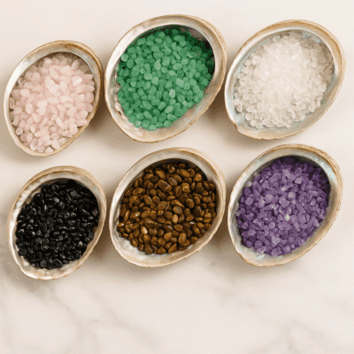 🔸 Cristal de roche : Clarté, énergie et amplification. Véritable pierre de lumière, elle purifie les énergies et renforce les intentions.