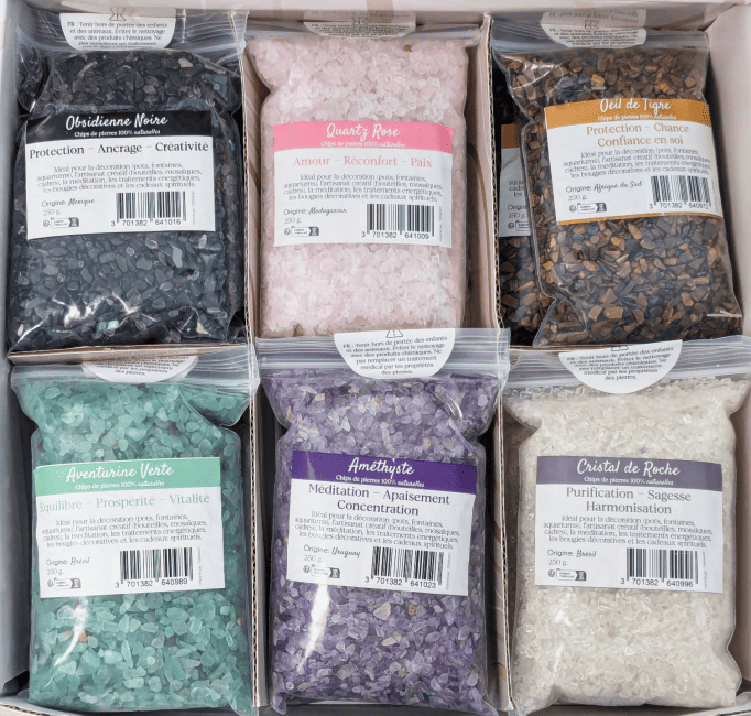| chips_de_pierres | Aventurine, Obsidienne, Œil de tigre, Améthyste, Cristal de roche, Quartz rose |