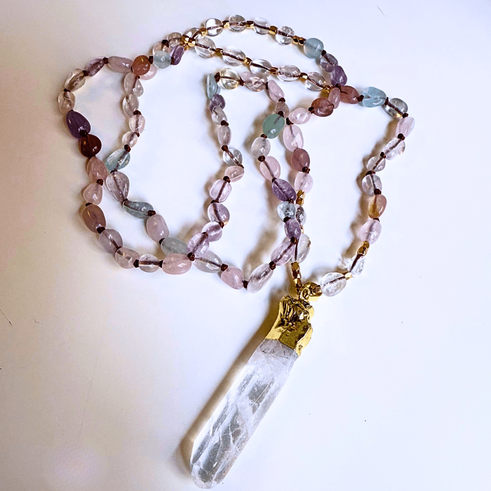 Il est agrémenté d’un grand pendentif en cristal de roche brut, de 3 à 5 cm selon les pièces, entouré d’un sertissage doré artisanal qui lui donne un caractère lumineux et raffiné.