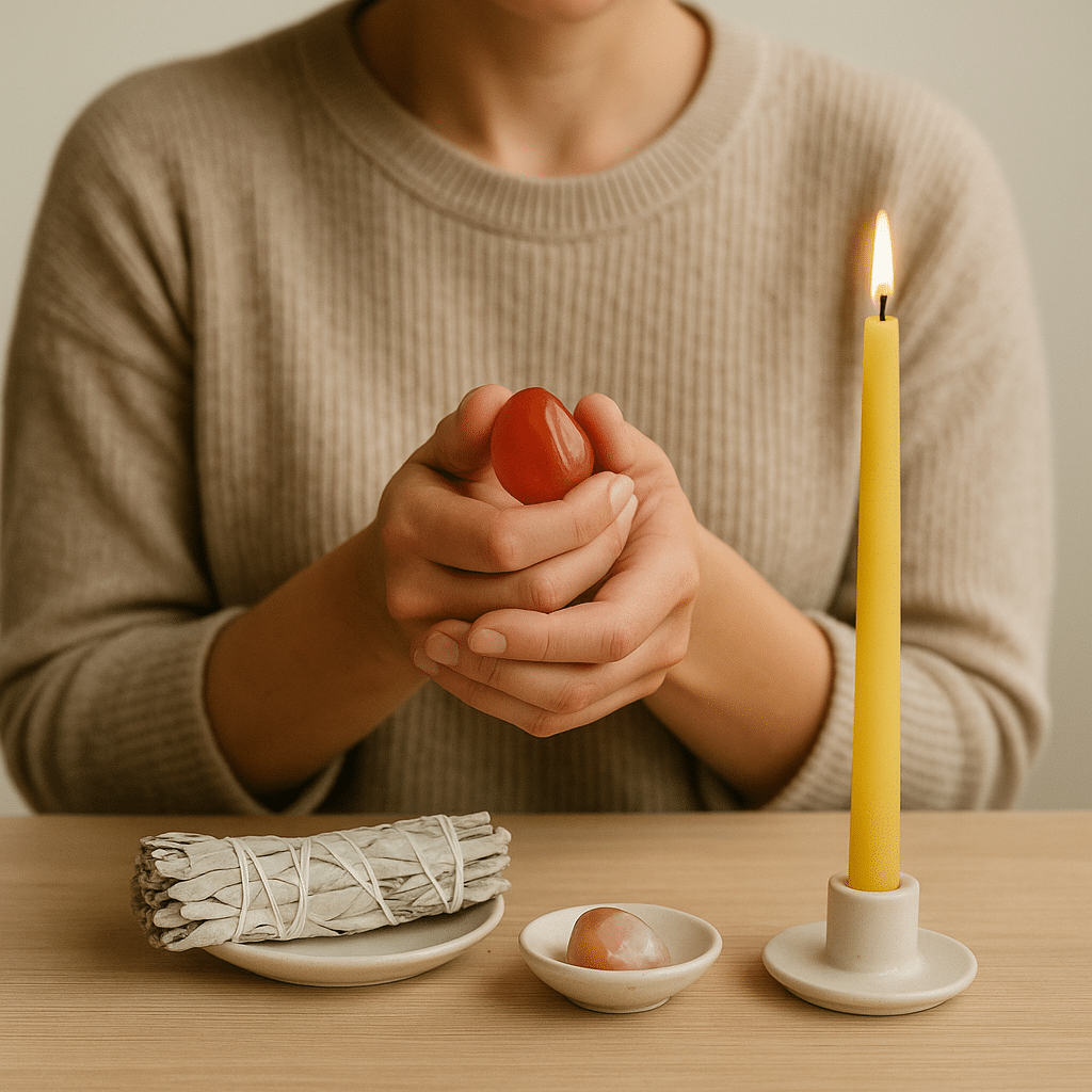 La sauge blanche nettoie l’énergie négative, la bougie jaune symbolise la clarté mentale et la cornaline inspire le courage. Utilisez-les ensemble dans un rituel simple que nous inclurons avec votre commande !