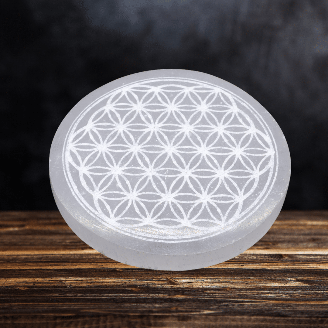 Plaque en sélénite gravée Fleur de Vie (Ø 10 cm).