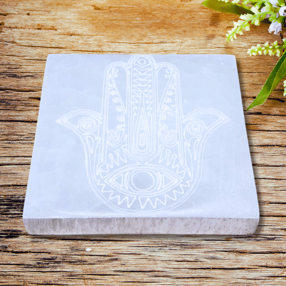Plaque Sélénite – Main de Fatima (Carrée 10 cm)