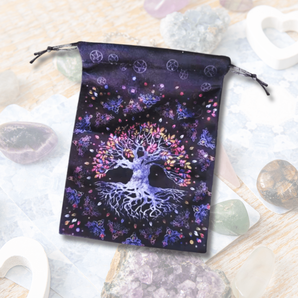 Une pochette en velours profond et mystique, ornée d’un Arbre de Vie aux racines puissantes et feuillage multicolore, entouré de pentacles subtils. Symbole de sagesse, d’équilibre et de connexion entre les mondes, elle accompagnera parfaitement vos jeux de cartes, cristaux ou rituels.