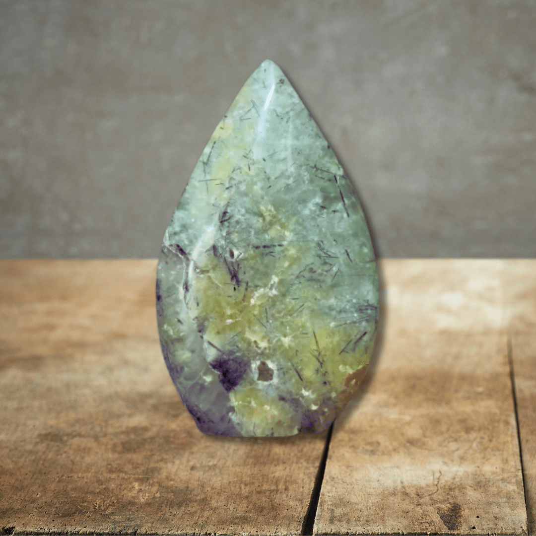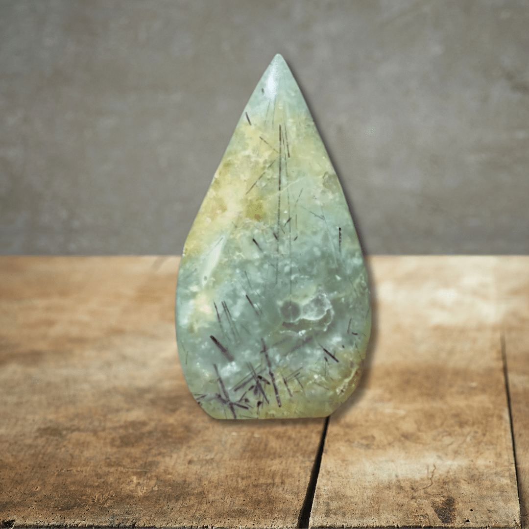 Les inclusions naturelles de tourmaline noire renforcent l’énergie de la prénhite en apportant ancrage et protection.