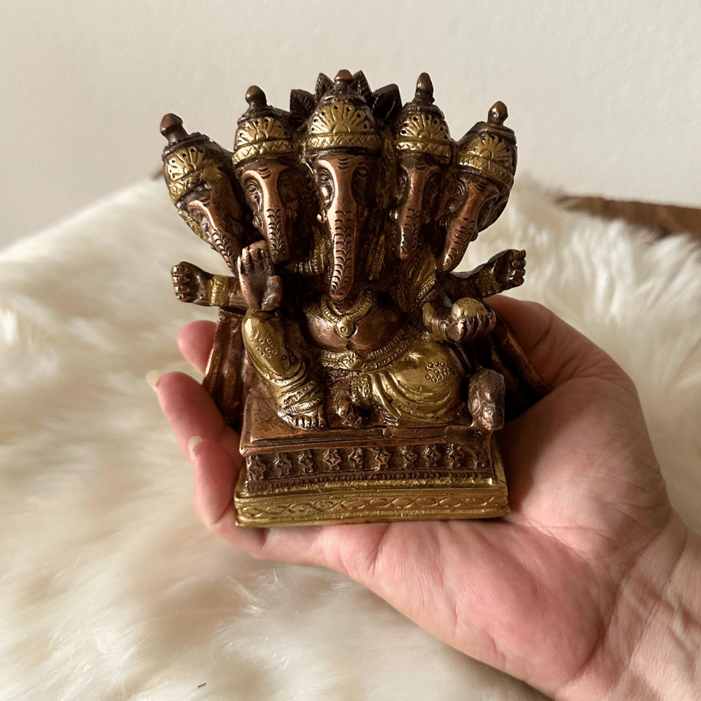 Cette magnifique statue de Ganesh à 5 têtes, en laiton, est un symbole puissant de sagesse, de prospérité et de protection. Représentant le dieu hindou bienveillant, Ganesh, sous sa forme rare à cinq têtes, cette statue incarne l’énergie divine dans toute sa splendeur.