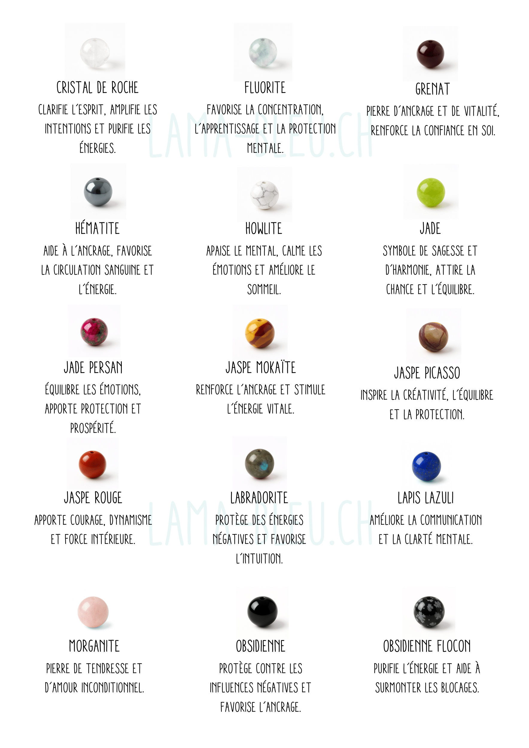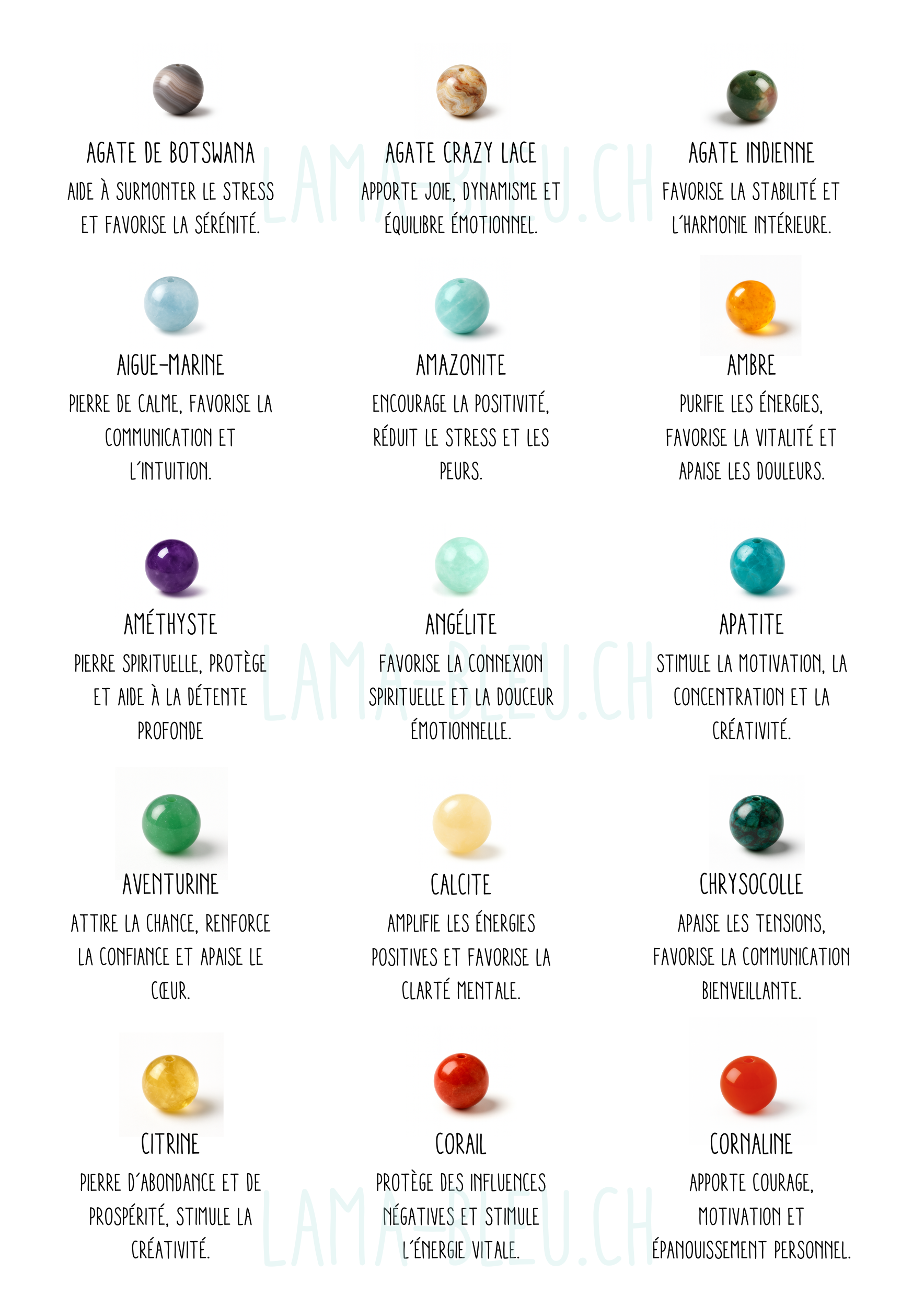 (Les vertus détaillées de chaque pierre se trouvent plus bas dans la description.)